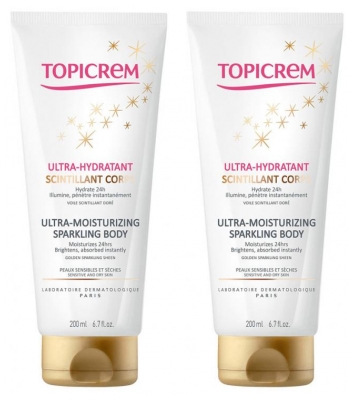 Topicrem Scintillante Corpo Ultra-idratante 2 x 200 ml in forma di emulsione cremosa, penetra rapidamente nella pelle, per idratare per 24 ore e illuminare.